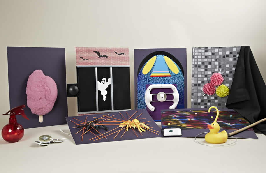 beads on sparkly material with sound / candy floss / hoop and duck / dodgem wheel / three coins / water spray / ghost train / spider web / slime balls / black material
